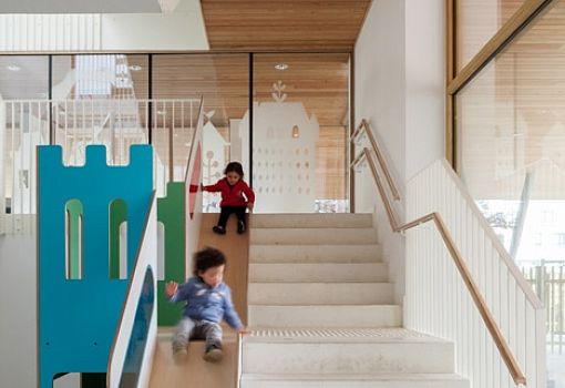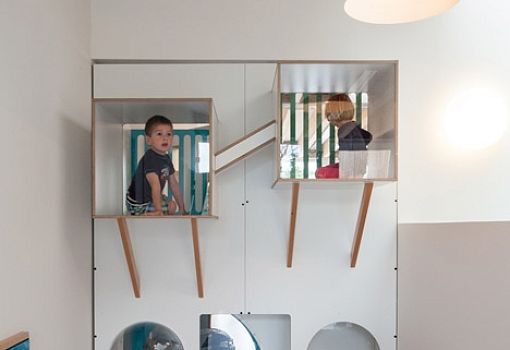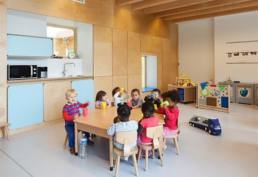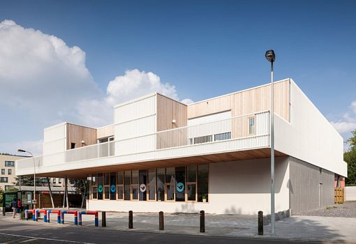 В этом детском саду, придуманном и воплощенном брюссельской архитектурной студией ZAmpone Architectuur, мебель, спальные гарнитуры и даже лестница спроектированы в «детском масштабе», чтобы быть доступными для маленьких посетителей. Названное Pluchke, что переводится как «пушистый», новое здание заменило прежний детский центр. Дешевле оказалось снести старое строение и возвести на его месте новую структуру. Количество ребятишек, которых готов ежедневно принять детсад, возросло с 35 до 75. Шесть детских групп расположены по периферии верхнего этажа здания. Для наружной и внутренней отделки использованы такие материалы, как керамическая плитка, сталь и дерево. Ритм белых стальных жалюзи, установленных на балконе первого этажа, нашел свое отражение в дизайне балюстрады лестницы. Жалюзи проходят по краям фасада, создавая единую эстетику, а также подчеркивая игру света и тени на белых поверхностях. Встроенная мебель установлена в различных, порой неожиданных местах, создавая укромные уголки, где дети могут спрятаться и передохнуть от беготни. Положение мебели и предметов интерьера, в том числе высота крепления крючков для верхней одежды и перил, было «подогнано» под детский рост.