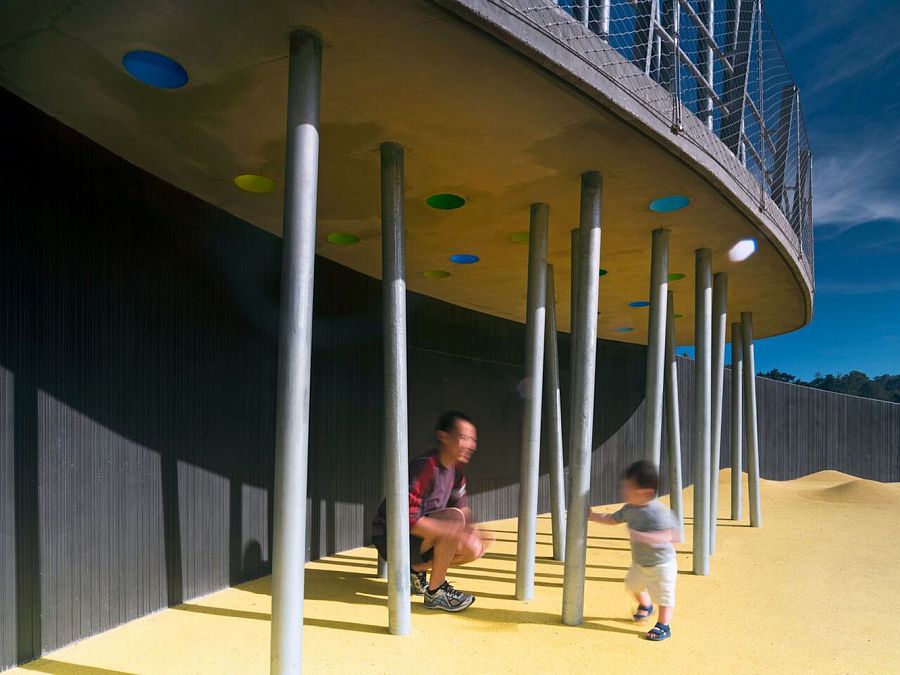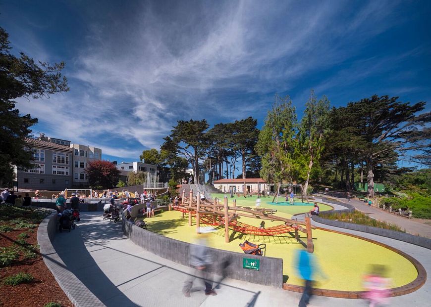 Архитекторы американского бюро Bohlin Cywinski Jackson создали в Калифорнии детскую игровую площадку Mountain Lake Park, удачно вписав комплекс в природное и архитектурное окружение. Кажется, что эта площадка всегда была здесь. Основной элемент комплекса, повторяющего очертания природного ландшафта, – террасированные зоны для различных видов активности и возрастов детей. На самом верху холма запроектирована платформа с хорошим обзором, опирающаяся на стальные колонны. Они символизируют расположенный рядом лес. В зоне так называемых Песчаных дюн играют только самые маленькие дети. Для создания игровых площадок и скульптур использована натуральная древесина.