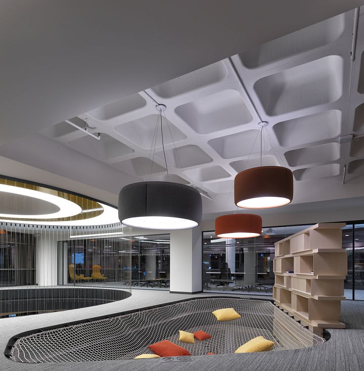 Первое, что бросается в глаза на входе, - просторная галерея высотой в пять этажей с пятью застывшими в воздухе мостами. Каждый мост имеет свое название и особое цветовое решение (от ярко-желтого до темно-красного), в качестве контрастного фона выступает матовый черный. Мосты связывают каждый этаж с уютной спальней в той же цветовой гамме. Концепция каждого этажа уникальна и была разработана в соответствии с потребностями отдела, который будет на нем размещаться.
