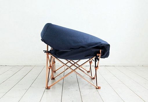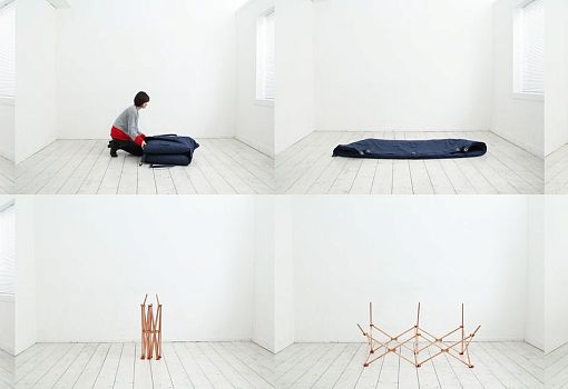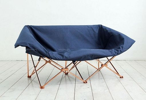 Молодые кореянки Со Хёнчин (Seo Hyunjin) и Ким Джэкён (Kim Jaekyoung) пять лет назад закончили отделение мебельного дизайна Сеульского университета Hongik. За это время они успели поработать на разные компании, поучиться в Европе, принять участие во множестве выставок, получить несколько наград и создать собственную студию под названием Kamkam. На миланскую выставку Salone Satellite девушки привезли уникальный раскладной переносной диван Kamp. Модель состоит из двух частей: отдельная мягкая верхняя часть, которую можно скатать в рулон и сложить в сумку, и складное металлическое основание, которое сдвигается-раздвигается по принципу пантографа - в сложенном виде оно очень компактно и легко помещается в небольшой цилиндрический чехол. Размеры дивана в разложенном состоянии 170х70х73 см. Авторы позиционируют свою разработку как ситуативно используемый временный предмет мебели или как диван для приверженцев модного «кочевого» образа жизни.