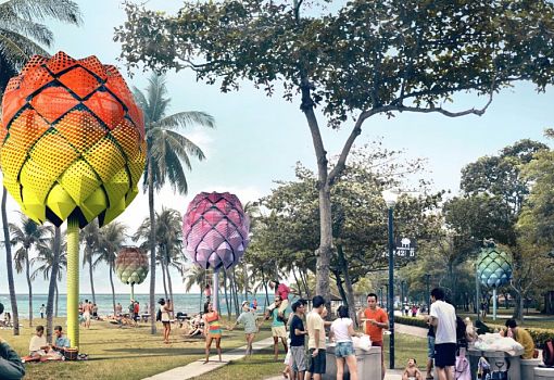 Архитекторы из студии SPARK придумали, куда девать огромное количество мусора, вылавливаемого из Тихого океана. Они предложили строить из него…пляжные бунгало в Сингапуре, по форме напоминающие гигантские разноцветные леденцы на палочке. Использовать предполагается высокоплотный полиэтилен HDPE. Его будут перерабатывать и пускать на производство объемных фасадных панелей - «чешуек». Их будут крепить на деревянном каркасе хижин, внутрь которых можно попасть при помощи лестницы и люка.