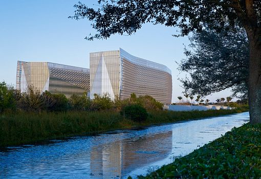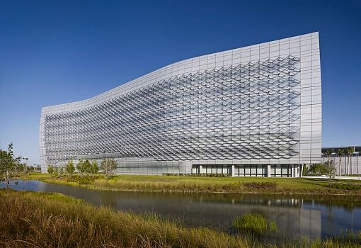 Новое семиэтажное офисное здание ФБР в Южной Флориде, проект которого разработала студия архитектурного дизайна Krueck+Sexton Architects из Чикаго, официально открылось в апреле. Здание со сплошным остеклением площадью 34 800 кв. м. максимально использует естественное освещение. Специальные покрытия для стекла и фасады из перфорированных металлических панелей пропускают солнечный свет, но препятствуют перегреву постройки. На крыше гаражей и хозяйственной пристройки установлены солнечные батареи. Перед началом строительства участок земли был засыпан гравием, на нем не было почти ничего живого. Поэтому неотъемлемой частью строительных работ стало восстановление экосистемы водно-болотистых угодий и создание пруда. Вода стала дополнительной мерой безопасности здания ФБР, как альтернатива стенам и тумбам, предусмотренным Федеральным правительством для обеспечения дополнительной безопасности после событий 9/11. «Мы хотели построить здание для людей, которые там работают, а не просто выполнить проект, соответствующий нормам ФБР», - сказал директор фирмы Марк Секстон.