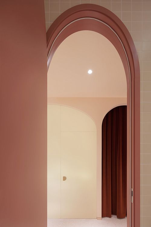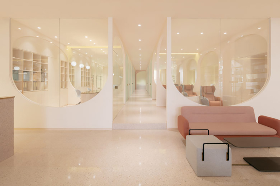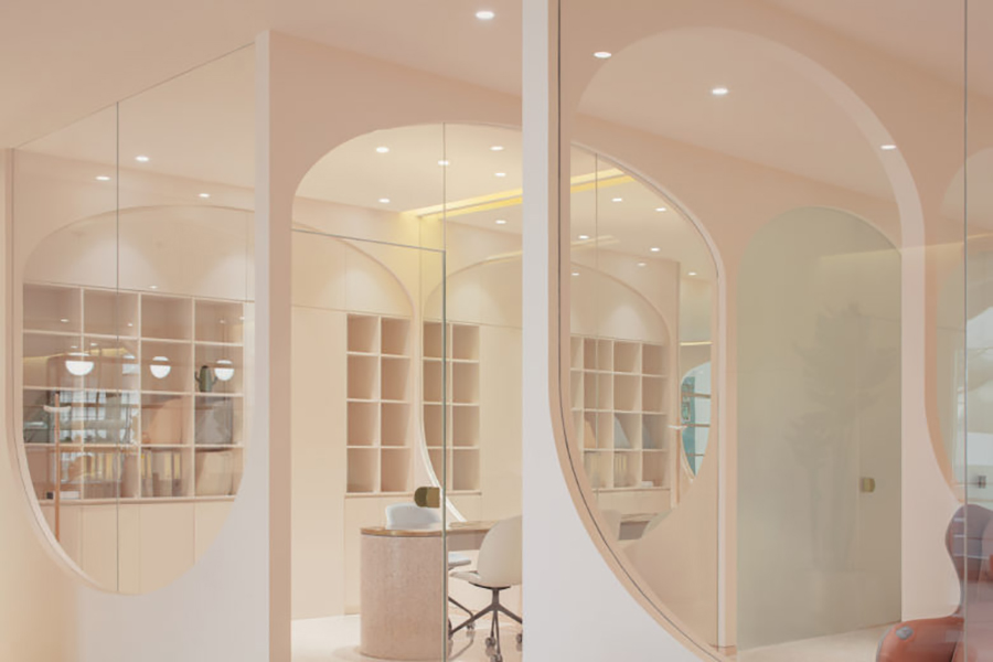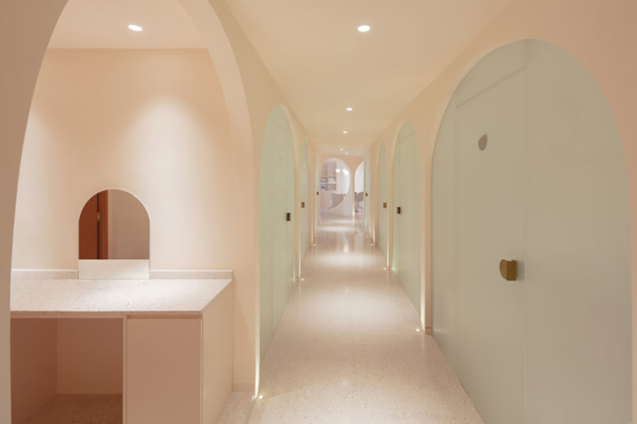 Одной из главных проблем интерьера, занимающего несколько этажей (площадь около 500 кв.м), была неудовлетворительная инсоляция. Авторы проекта решили эту проблему, выбрав светлые тона декора и насытив внутреннее пространства салона большим количеством зеркальных плоскостей. Интерьер представлен в виде череды взаимосвязанных небольших помещений со сводчатыми потолками, которые напоминают пещеры, являющиеся, по мнению авторов, архетипическими природными сооружениями. В сознании человека, даже современного, они ассоциируются с защитой, безопасностью, покоем. Кроме нескольких оттенков белого архитекторы использовали и розовые тона, создающие расслабляющую атмосферу.