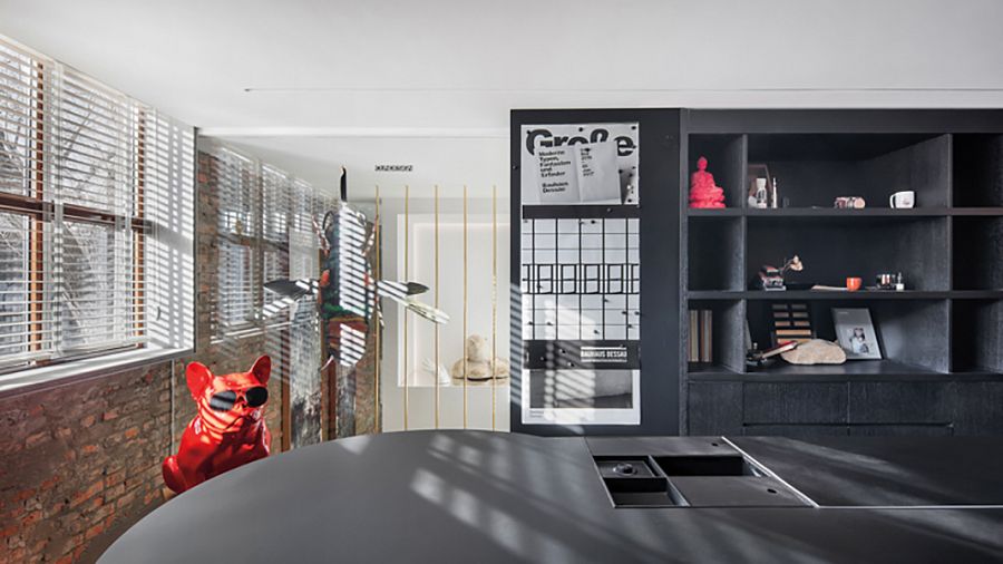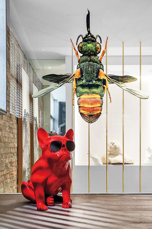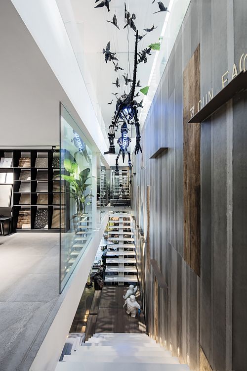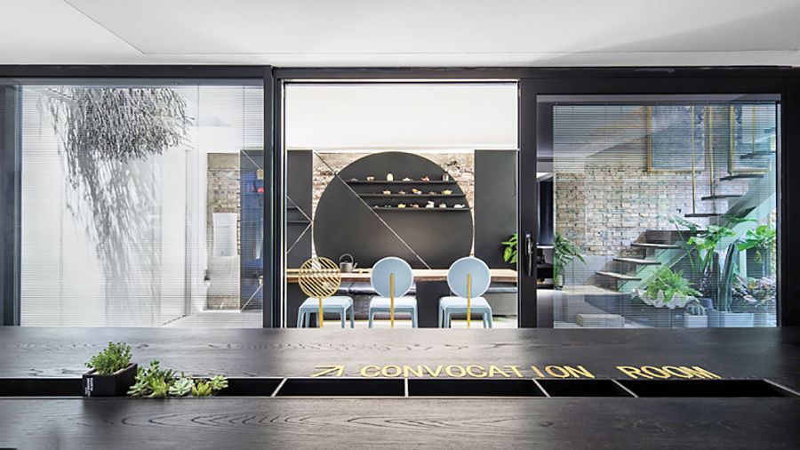 Новый офис расположен в реконструированном промышленном здании постройки 80-х годов прошлого века. Мелкие интерьерные объекты играют важнейшую роль в этом проекте. На первом этаже прямо напротив входа запроектирован бар с частично зеркальным потолком, отражающим нагромождение предметов — мотоциклетных шлемов, книг, обрамленных фотографий и так далее. «Я попросил сотрудников принести в офис их личные вещи, чтобы персонализировать зону, которая предназначена для собеседования с клиентами, коротких «летучек» или проведения праздников», — рассказывает Куи Шу.