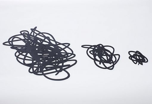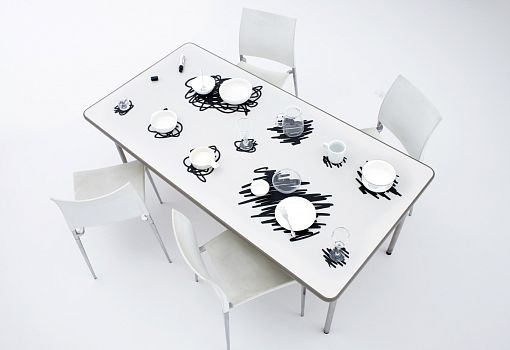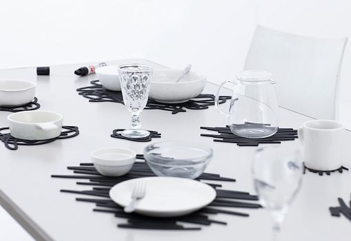 Коллекция сервировочных салфеток-подставок Scribble имитирует небрежные росчерки черным маркером. Два типа узоров в трех вариантах размера (маленький – 11х11 см, средний – 22х22 см и большой – 33х45 см) вырезаны при помощи лазера из эластомера толщиной 3 мм.