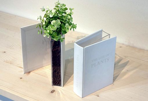 Book – цветочный горшок в форме книги. Сделан из полиметилметакрилата, дополнен водозащитой из ПВХ. Для максимального визуального эффекта может быть помещен среди настоящих книг, но также способен и стоять самостоятельно – для этого надо немного приоткрыть «обложку».