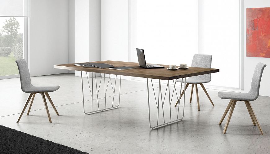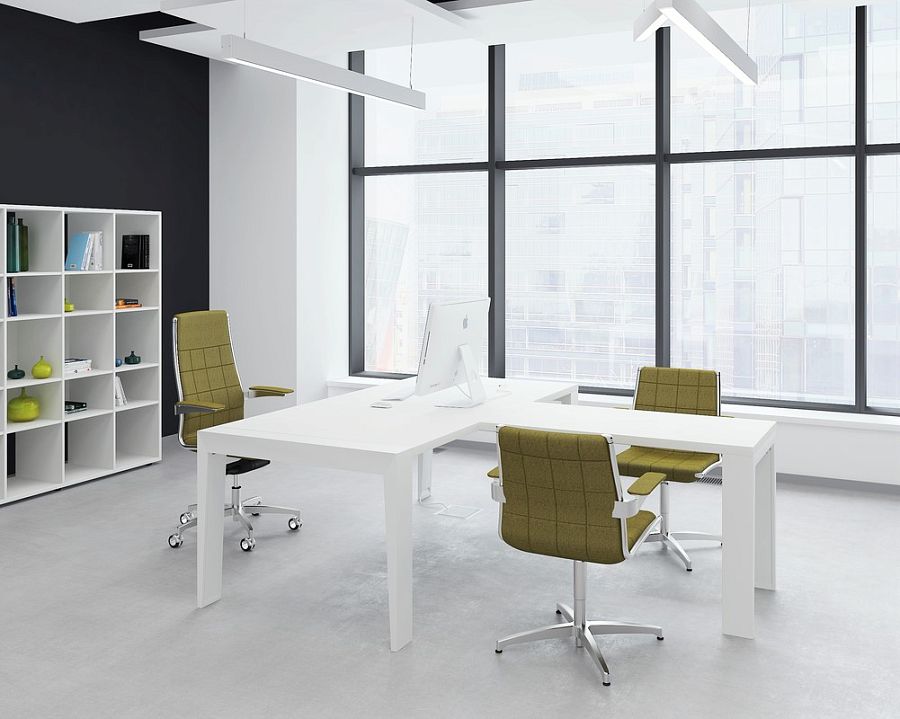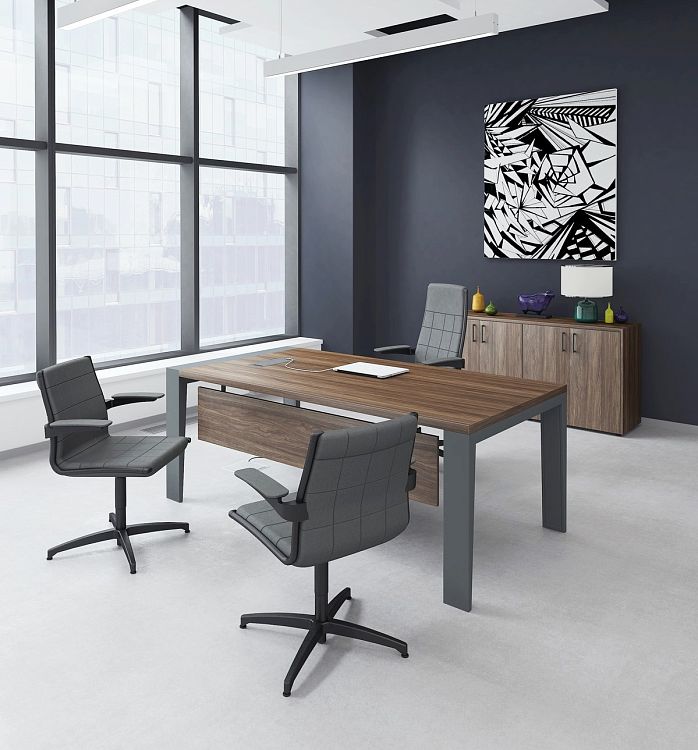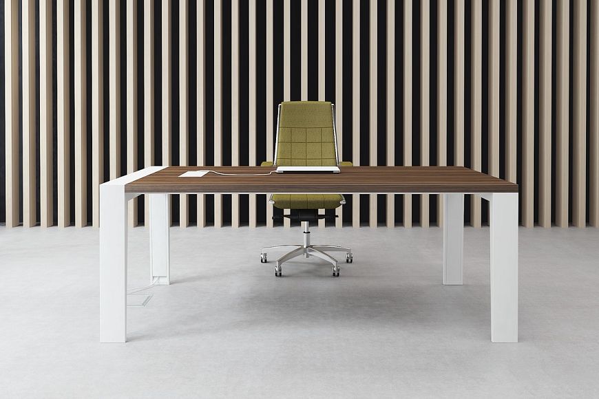Кабинет для руководителя Mahia отличается выразительным сочетанием меламиновых столешниц и дизайнерских металлических опор. Необычные пропорции создают запоминающуюся форму, в которой соединяются статусность, эстетика и функциональность.