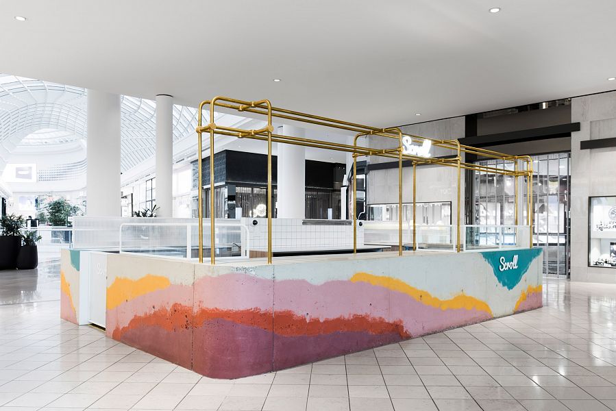 «Монолитный фасад торговой точки выделяется среди других объектов торгового центра. Средствами дизайна нам удалось сосредоточить внимание покупателей как на самом продукте, так и на производственном процессе, в основе которого перемешивание слоев фруктов, ягод, орехов и ароматических добавок», рассказывают авторы этого небольшого проекта.