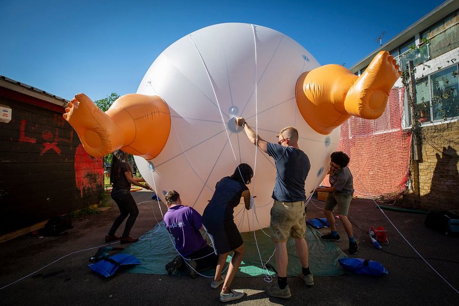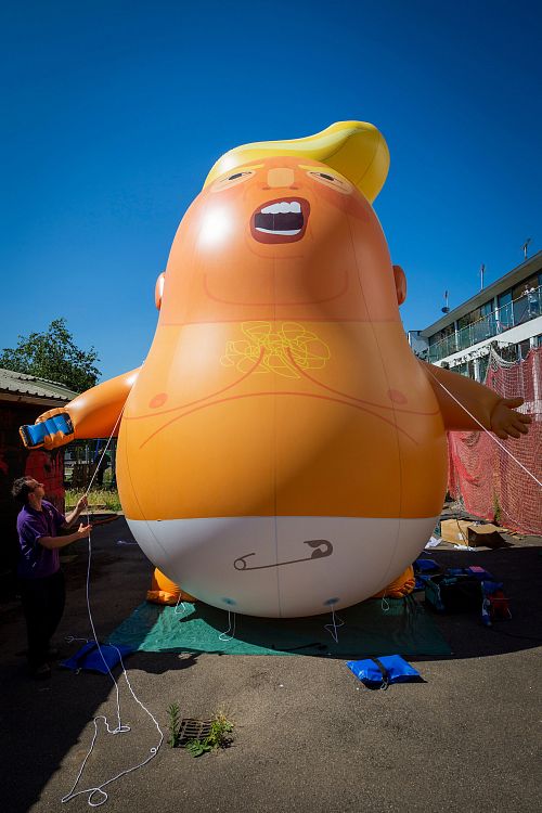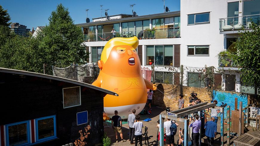 К примеру, группа дизайнеров во главе с Лео Мурреем решила выразить свой «художественный протест».  По замыслу весельчаков, с 9.30 до 11.30 утра 13 июля над Британским парламентом зависала…гигантская шестиметровая надувная фигура «мультяшного» Трампа в образе непослушного карикатурного младенца. Инсталляция была запущена с территории парламентских садов, расположенных рядом с историческим зданием. Средства на реализацию скандальной идеи были собраны при помощи краудфандинга. Любопытно, что участники загодя направили петицию мэру Лондона Садику Хану с просьбой разрешить акцию. Бумагу подписали более 10 000 лондонцев. И мэр сдался, официально разрешив провернуть эту штуку.