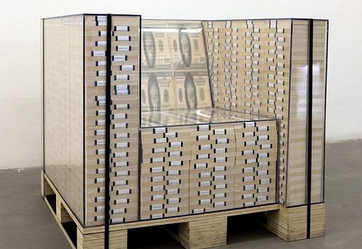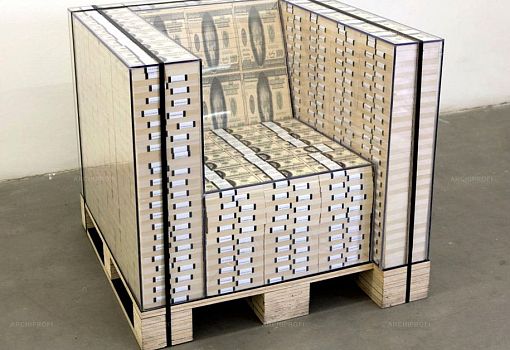 Для кресла Buck$ дизайнеру потребовались поликарбонат, фанерная паллета и... 1 миллион 800 тысяч «баксов»: 180 стандартных банковских десятитысячных пачек из сотенных псевдокупюр. А где же череп? Присмотритесь внимательнее к рентгенограмме на месте привычного портрета Франклина!