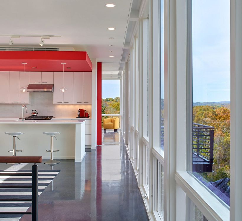Архитектоника объекта довольно проста: две бетонные фермы поддерживают вытянутый в длину объем, сделанный из стекла и стали. Внутри большего по размеру бетонного куба-опоры обустроена мастерская по металлу. Меньший куб – это фактически оболочка внутренней лестницы, связанной с главным входом. Кубические блоки связаны террасой из дерева ипе. Стеклянный объем, откуда открываются живописные виды на бывшую каменоломню, содержит основное жилое пространство. В восточной его чати, где три стены прозрачные, запроектирована студия. Кухня, гостиная и столовая помещены в центр плана. В южной части находится гостевая спальня, а в западной – приватная территория хозяина: спальня, ванная комната и гардеробная. Из хозяйской комнаты есть выход на металлический балкон, который служит точкой обзора. Таким образом получился объект, при первом взгляде на который можно сделать вывод, что здесь живет человек искусства.