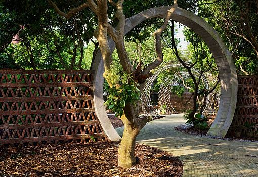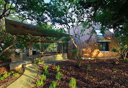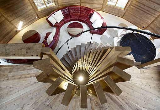 Дом в форме купола среди садов в Гаомине (КНР) построил британский предметный дизайнер Тимоти Оултон. Здание и окружающие его постройки выполнены почти целиком из вторичных материалов. Дом, стоящий на бетонном фундаменте, сверху облицован гонтом из красного кедра. Внутренняя структура напоминает паутину: длинные изогнутые колонны сходятся на самом верху, в одной точке. Из этой точки выходят скругленные балки, формирующие купол. Центральный элемент композиции – лестница, закручивающаяся спиралью. На нижнем уровне находятся гостиная и столовая с небольшой кухней. На антресоли – спальня. По признанию автора, сложность проекта заключалась в том, что вторичные материалы нужно было сертифицировать, стандартизировать и убедиться в их безопасности.