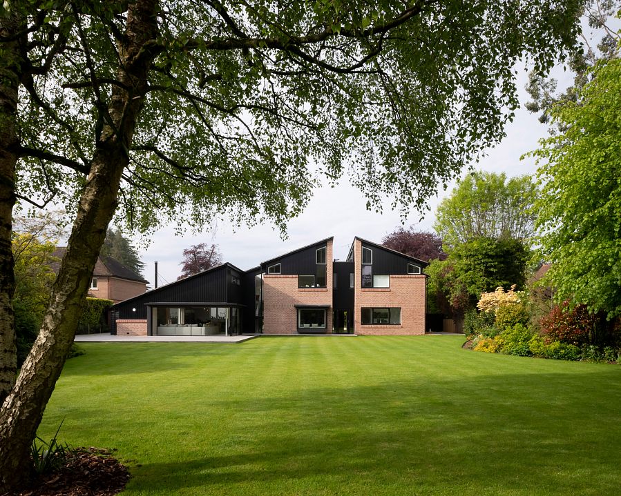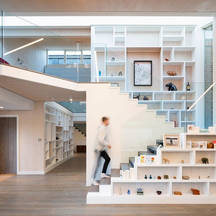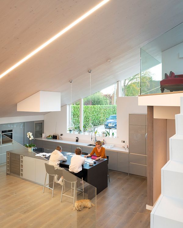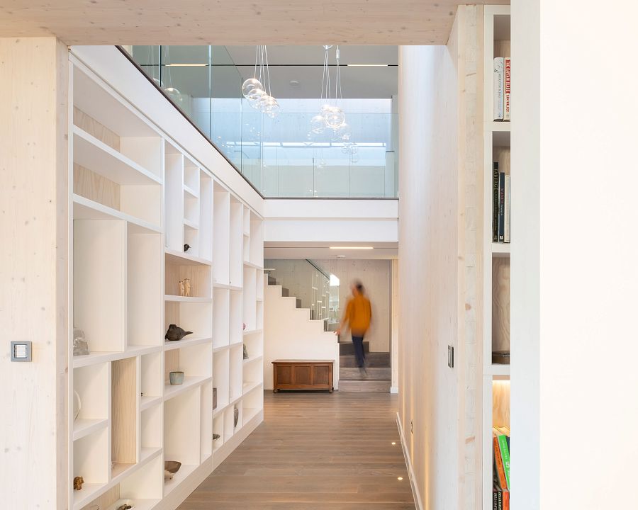 Здание сделано из многослойных клееных деревянных панелей CLT. Фасады частично облицованы темным кирпичом и плиткой. Основной, симметрично «разрезанный» объем был дополнен по просьбе заказчиков объемным элементом, внутри которого запроектированы гостиная, кухня и столовая. «Главным требованием владельцев был легкий и светлый интерьер. Именно поэтому мы решили прорезать в кровле зенитные окна», — рассказывают авторы. Для того, чтобы ничего не мешало потоку света проходить сквозь внутреннее пространство жилища, архитекторы даже оборудовали лестницы и открытые участки верхнего этажа стеклянными балюстрадами.