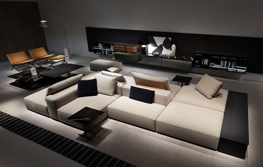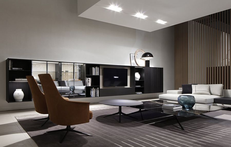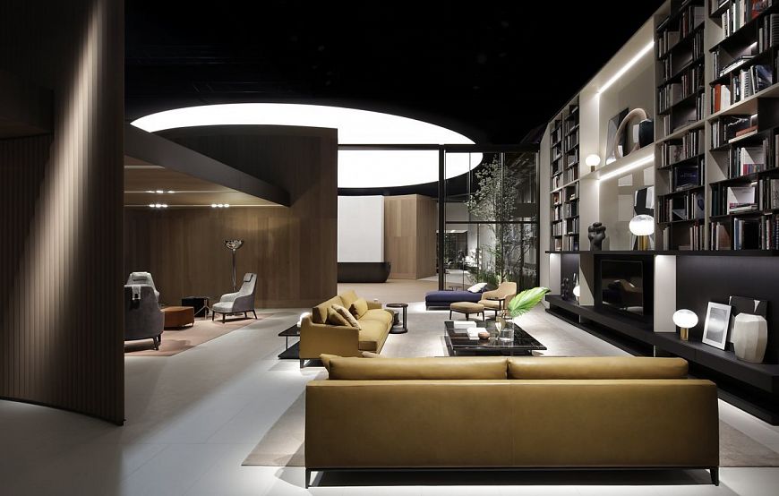 Главный центр притяжения и общения – велком-зону – разместили на круглой «пьяцце», своего рода центральной городской площади этого роскошного «поселения». Она открывала проход к череде сменяющих друг друга гостиных, столовых, спален, гардеробных, лаунжевых и кабинетных зон. И несмотря на обилие разнообразной мебели из разных коллекций, ни разу не возникло даже намека на диссонанс, поскольку стилистика марки виртуозно «заточена» под создание гармоничных концепций полной меблировки любого объекта.