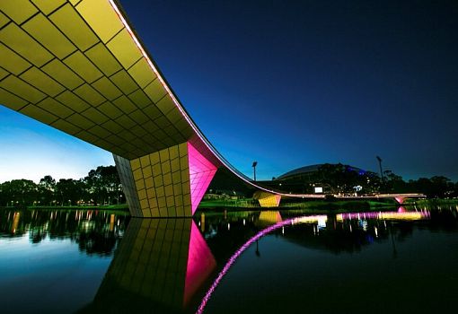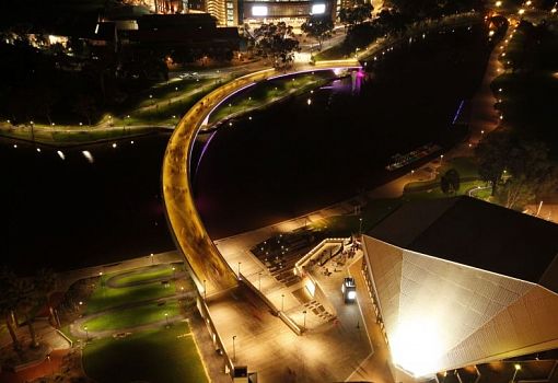 Проект Riverbank Precinct Pedestrian Bridge стал первым, реализованным в Аделаиде (Австралия) архитекторами Taylor Cullity Lethlean (TCL). Пешеходный мост выполнен в виде 255-метровой дуги, соединяющей разные части города. Композиция разбавлена динамичным освещением и интерактивными зонами, а в целом она демонстрирует изящные формы в монументальном исполнении. Например, опоры, кажется, держатся на самой водной глади.
