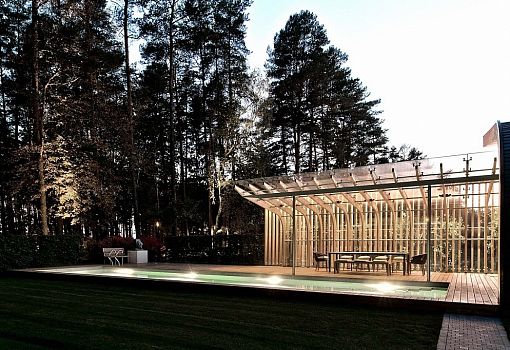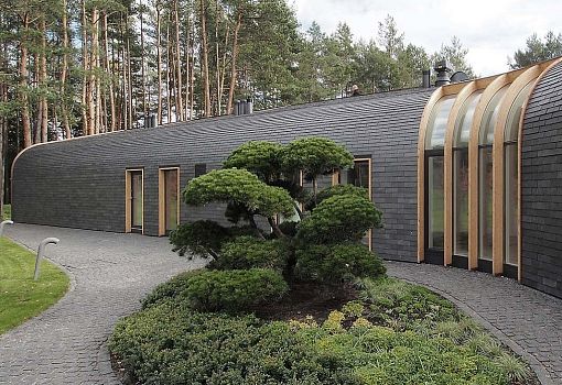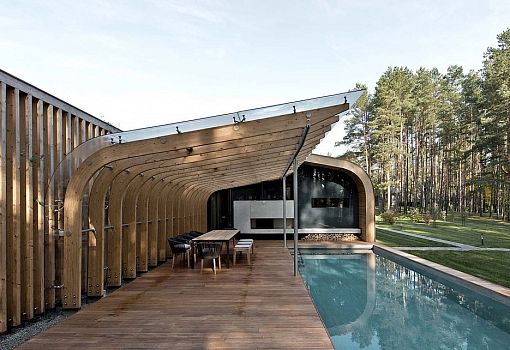 Архитекторы бюро Audrius Ambrasas Architects создали Villa G – особняк площадью в 520 кв.м. Основным требованием при проектировании было слияние сооружения с окружающим ландшафтом. Для того чтобы выполнить непростое требование, архитекторы максимально «прижали» дом к земле и растянули его в форме двух бумерангов, соединенных переходным элементом. Почти все плоскости виллы скруглены и выполнены из естественных материалов, что позволило в итоге перенести акцент с сооружения на окружающие красоты.