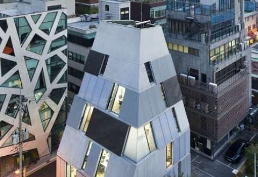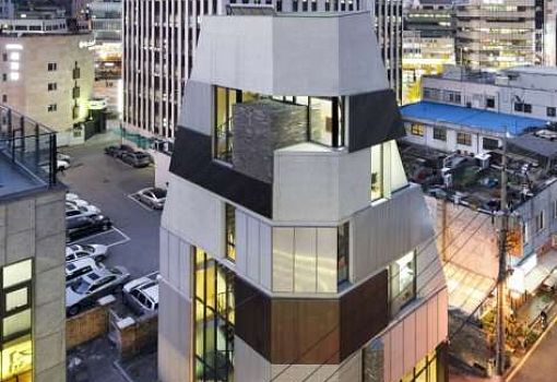 …попытались создать архитекторы бюро L’EAU design в Сеуле. Мы видим многофункциональную урбанистическую структуру, в которой есть жилые и торгово-развлекательные пространства. С точки зрения объемно-пространственной композиции объект представляет собой трапециевидный объем с асимметричными гранями. Хаотично разбросанные по фасаду окна и контрастирующие друг с другом элементы подчеркивают современный вид и незаурядную стилистику здания. Сооружение возведено на «пятачке» всего в 200 кв.м.