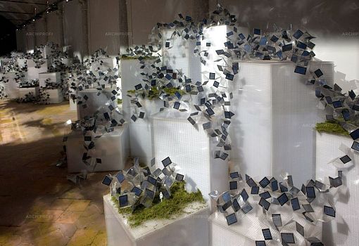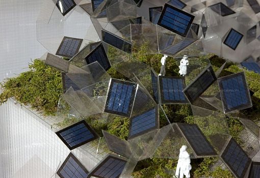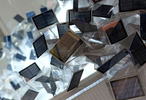 На Миланской неделе дизайна японский архитектор Акихиша Хирата (Akihisa Hirata) показал проект, в котором солнечные батареи не только используются по прямому назначению, но и являются архитектурным компонентом городской среды. Его инсталляция Energetic Energies демонстрирует нам вид на городские кварталы с высоты птичьего полета: многоэтажные здания словно окутаны необычного вида сетью. Эта «сетка» - масштабная конструкция из множественно «набросанных» больших солнечных батарей, расположенных на разной высоте, в различных плоскостях и образующих сложный трехмерный паттерн.