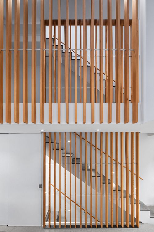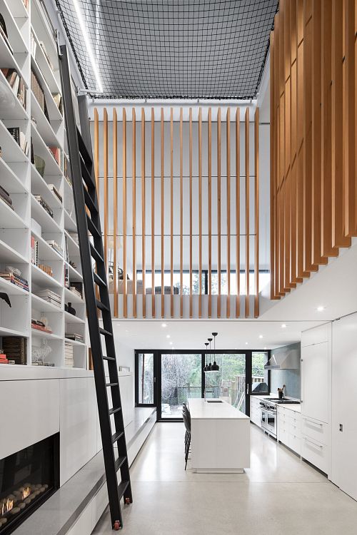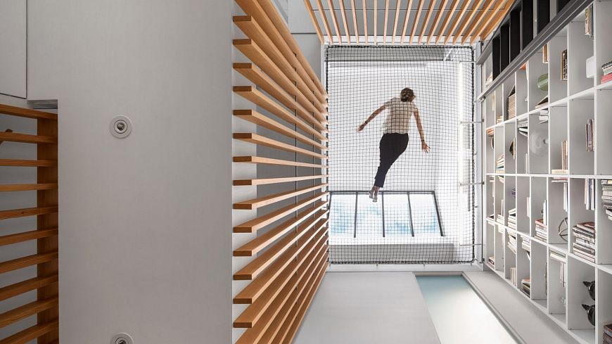 В результате реконструкции частного жилого дома в Вестмаунте (Канада), осуществленной студией Robitaille Curtis, в интерьере появился 9,7-метровый атриум, изнутри огороженный деревянными планками, а сверху затянутый металлической сетью.Таким образом авторы проекта подарили детям владельцев необычную игровую зону.