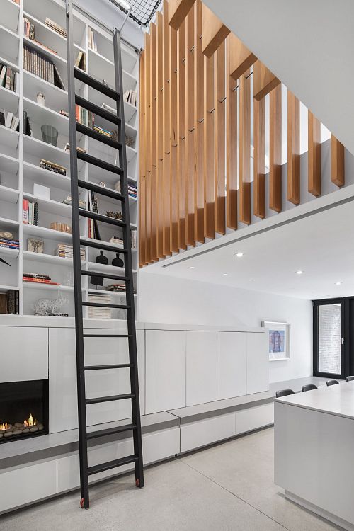 Интересно, что монтировали и проверяли сеть такелажники, сотрудничающие с цирком "Дю Солей". Одним словом, конструкция получилась надежная. "Фактически мы открыли для обзора третий этаж и помещения нижнего этажа для наблюдателя, который находится на самом верху", - рассказывают авторы проекта. - Второе преимущество металлической сетки в том, что наверху нам удалось обойтись без поручней и дополнительных ограждений. В гостиной, "на дне" атриума установлен современный камин, а над ним - большая система хранения для книг с металлической лестницей высотой 5, 5 м. Образовавшийся световой колодец на уровне первого и второго этажей выложен сосновыми планками. Деревянные экраны обеспечивают приватность и выполняют функцию поручней.