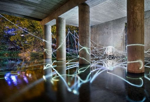 Инсталляция архитекторов Clark Richardson Architects призвана продемонстрировать спорный контраст между природой и искусственным управлением естественными процессами. Поводом стала сеть тоннелей, перенаправляющих ток дождевой воды в городе Остин (США). Инсталляция Natural Unnatural представляет собой хаотично расходящиеся нити света от единого центра под одним из мостов города.