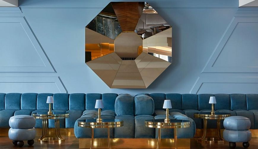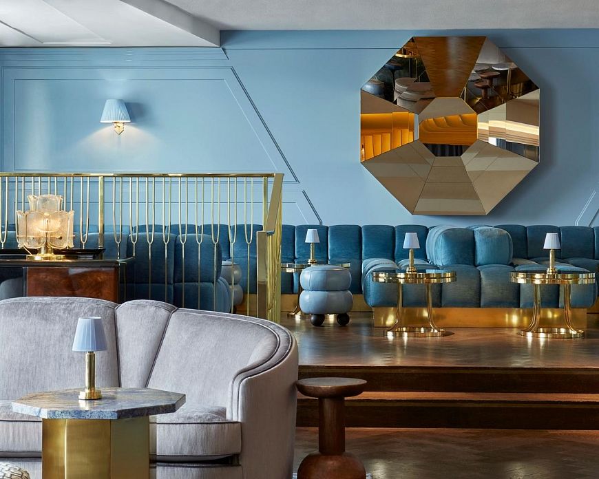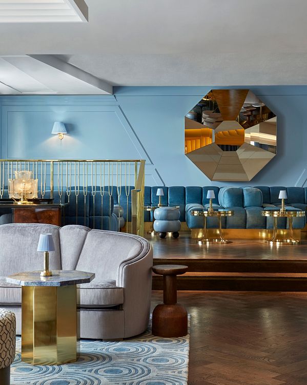 Колористическое решение основано на «морской» тематике (светло-голубые и светло-серые оттенки), которая просматривается также и в декоре мягкой мебели в лаунже и гостевых зонах. Лейтмотив поддерживается и стойкой бара, сделанной из зеленого мрамора. Оригинальность пространству придают голубые и бронзовые зеркальные коктейльные столики.