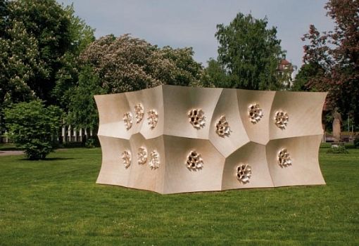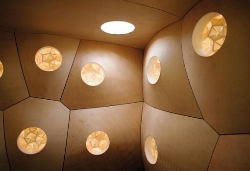 Павильон HygroSkin в прямом смысле слова можно назвать дышащим. Конструкция из фанерных модулей призвана обеспечить взаимодействие архитектуры и климата для обеспечения вентиляции без участия сложной техники. Студент Штутгартского университета Ахим Менджес в своем проекте предложил вогнутые элементы, в центре которых расположены конические объемы из отдельных лепестков. Данные структуры изменяют свое положение в зависимости от влажности, обеспечивая, таким образом, воздухообмен.