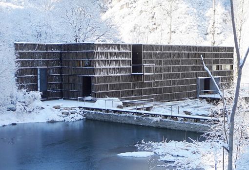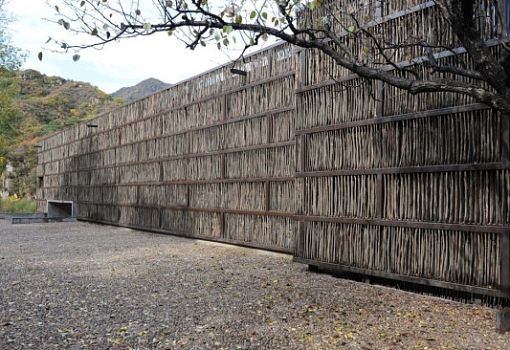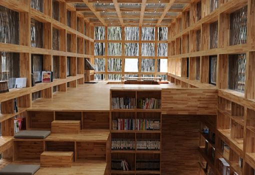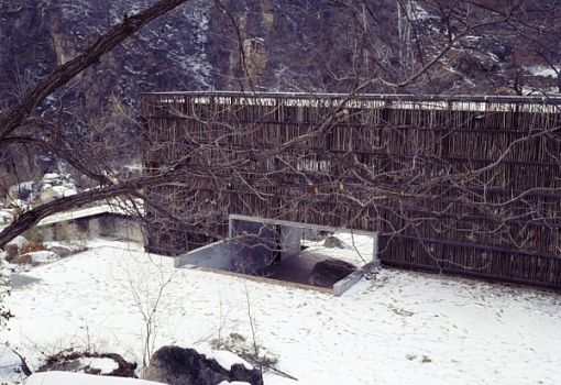 Скромная, но чувственная архитектурная композиция находится в Лиюане (предместье Пекина, КНР). Библиотека от бюро Li Xiaodong Atelier полностью выполнена из природных материалов. В качестве материала для отделки фасада использовался хворост, которым местные жители отапливают дома. Благодаря этому приему сооружение идеально вписывается в окружающий ландшафт. Дневной свет попадает внутрь помещения сквозь просветы между вертикальными элементами фасада.
