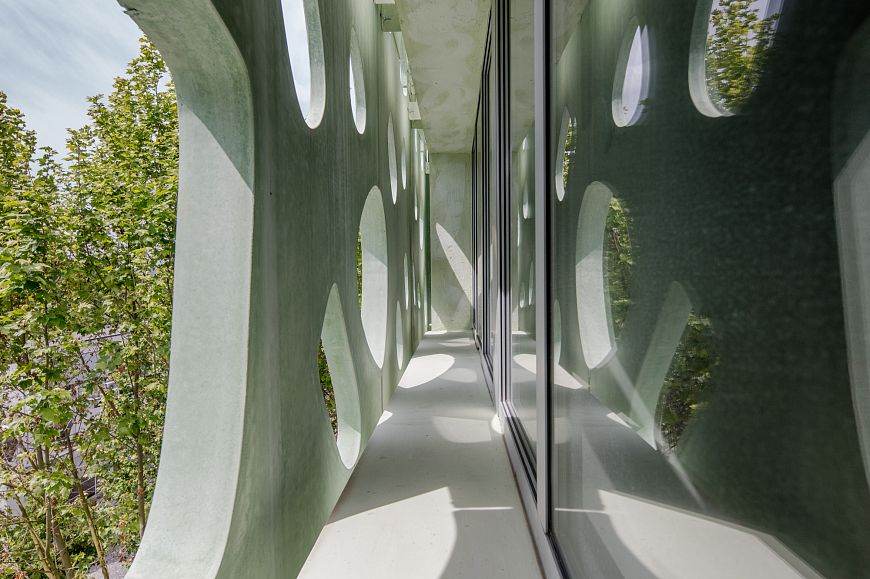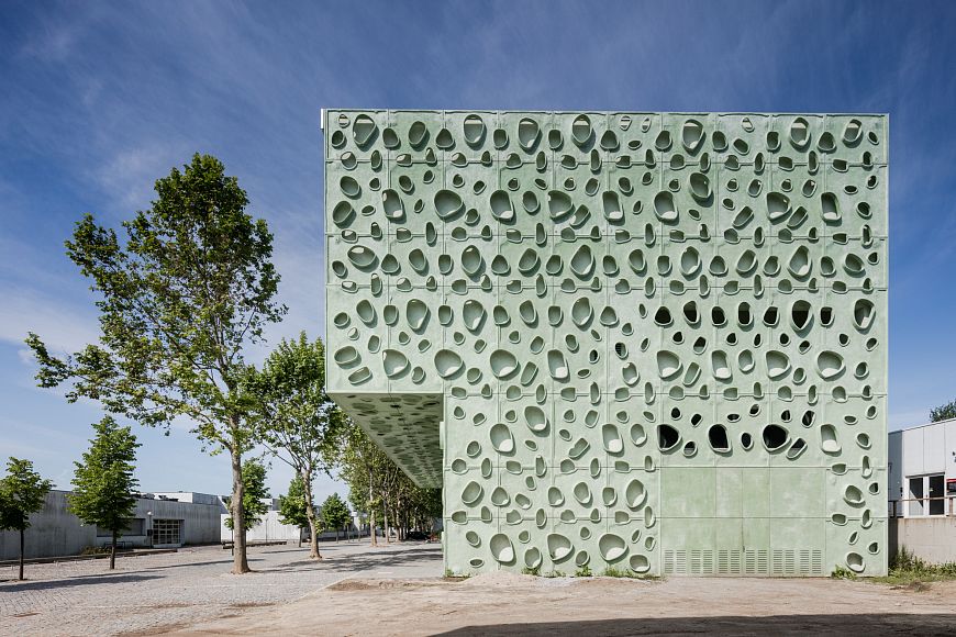 Здание с уникальным фасадом, построенное по проекту Клаудиу Виларинью (Cláudio Vilarinho) для студгородка университета Азуреум, «ломает» существующую серую монотонность и очаровывает. Его монолитный блок облицован панелями мятного оттенка с округлыми отверстиями различной формы и размера, явно намекающими на титановые трубки, которые исследуют сотрудники института.