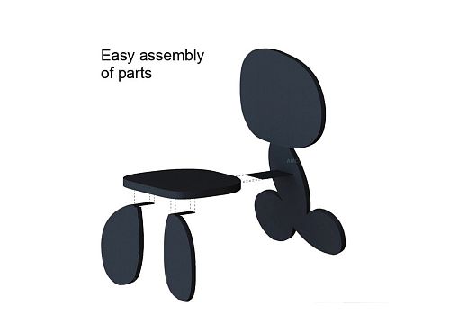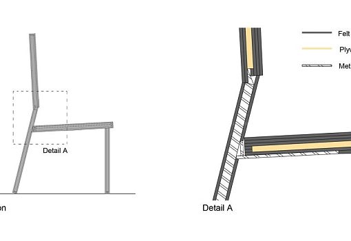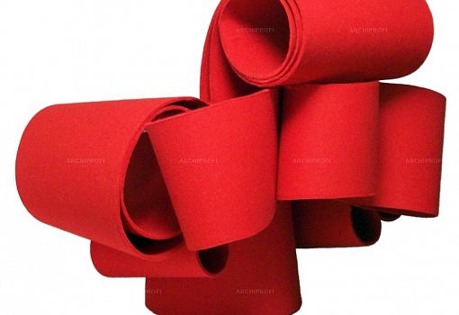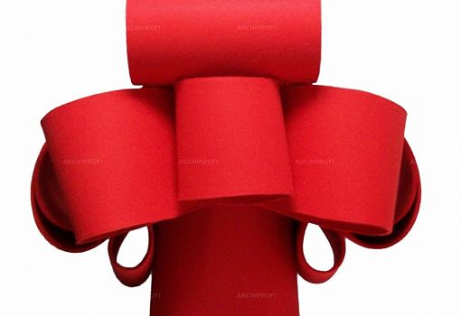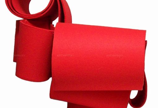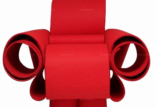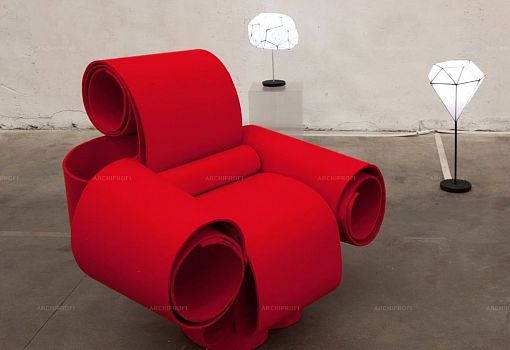 Под ярко-красным фетром эффектного кресла Re bon bon скрываются свернутые рулонами листы пластика толщиной 2,4 мм. Конфигурация и взаиморасположение «свитков» продуманы таким образом, чтобы в итоге получилась устойчивая конструкция. Пластиковые части соединены металлическим штырями, фетровый слой – приклеен.