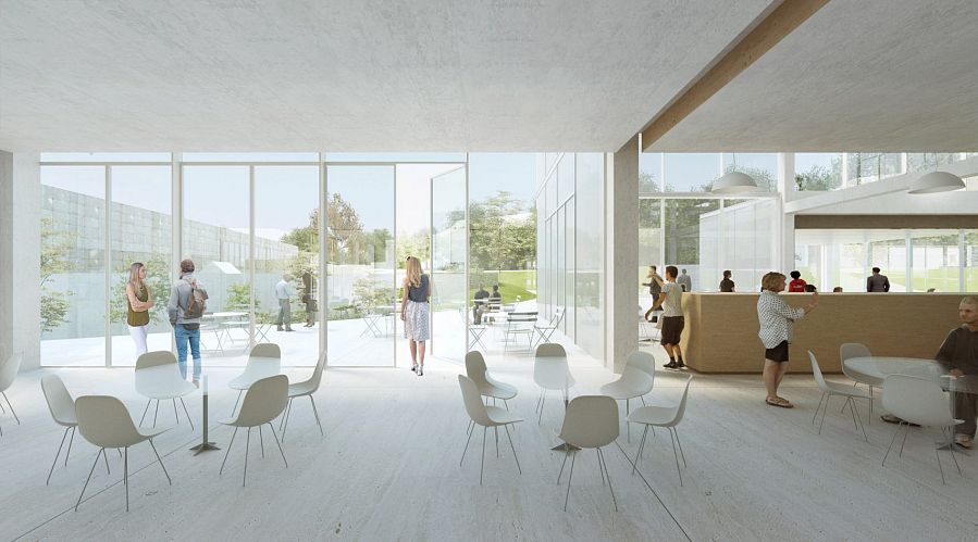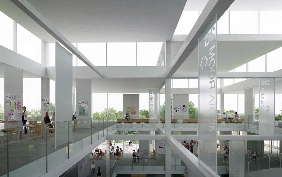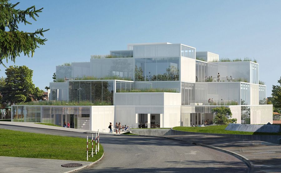 Знаменитый японский архитектор Соу Фудзимото разработал проект учебного центра университета Сен-Галлен в Швейцарии. Объемно-пространственная композиция основана на соединении прозрачных кубических элементов с белыми гранями.