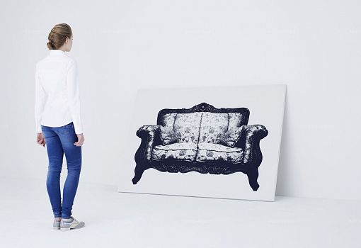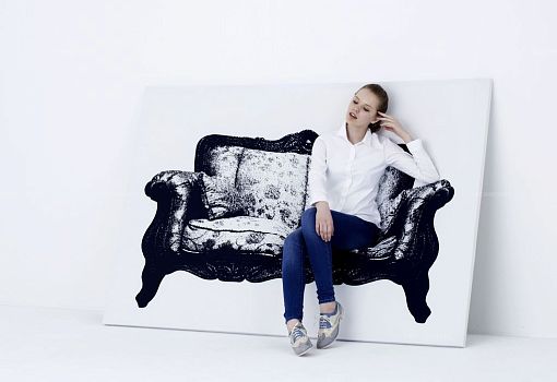 На стене висит картина. На картине изображено кресло в натуральную величину. На первый взгляд ничего необычного: натянутый на прямоугольную раму холст, на холсте – черно-белый принт. Фокус заключается в том, что это не просто изображение, а самое настоящее кресло, на котором можно сидеть! Достаточно снять картину, прислонить ее к стене и – пожалуйста, присаживайтесь. Да-да, прямо в рисунок – почувствуйте себя сюрреалистическим персонажем. Имитирующая холст эластичная ткань прогнется, и вы ощутите под собой откидное сиденье, до этого полностью спрятанное в плоскости рамы.