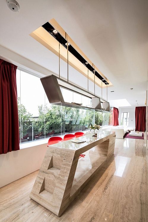 Большие площади остекления ориентированы таким образом, чтобы улучшить инсоляцию, но без нарушения неприкосновенности частной жизни. Балконы и открытые террасы нависают над бассейнами на задних дворах. Кирпичный цвет кровли контрастирует с белым монохромом фасадов. Архитектурные формы обыграны в интерьере. Проект разработан бюро Mercurio Design Lab.