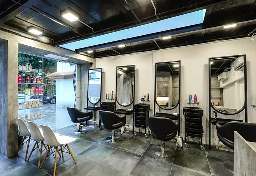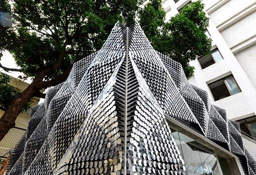 Многопрофильная архитектурная студия NUDES превратила заброшенный гараж в Мумбаи в салон красоты. С помощью светоотражающих дисков, вырезанных из акрила при помощи лазера, дизайнеры сформировали для строения не просто фасад, а блестящую шероховатую оболочку, многократно отражающую окружающий пейзаж и привлекающую внимание. В салоне общей площадью более 105 кв. м молодые парикмахеры и визажисты осваивают свое ремесло на практике. Дизайнеры NUDES снесли часть структуры бывшего гаража и вставили в крышу продольный оконный проем, что позволяет гостям видеть дерево, раскинувшее свою крону над зданием. Внутреннее пространство салона вмещает парикмахерскую, отдел ногтевого сервиса и зону мэйкапа.