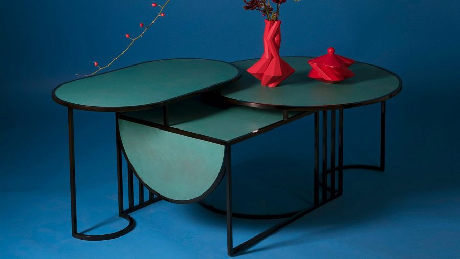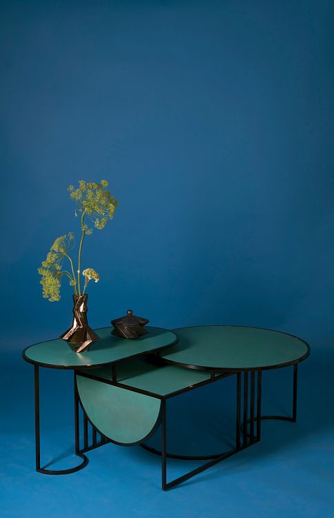 Между прочим, про орбиты мы упомянули не случайно, поскольку серия кофейных и чайных столиков называется Orbit. Это столы со стальным каркасом и столешницами из патинированной меди. Чайный столик состоит из двух полукруглых элементов со вставкой в форме литеры U, предназначенной для хранения журналов и газет. Разборный кофейный столик сделан из трех элементов – круга, овала и прямоугольника. Все они расположены на разных уровнях.