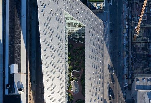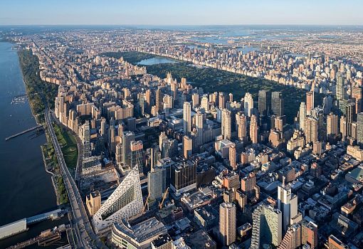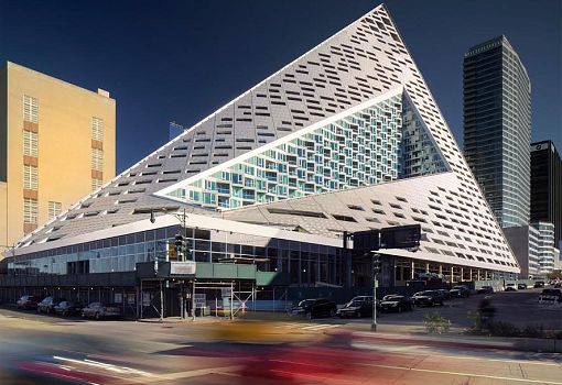 Проект VIA 57 WEST в Нью-Йорке архитекторов бюро BIG стал настоящим гибридом американских и европейских традиций. Пирамида имеет вырез для обустройства внутреннего двора, ставшего копией местного парка, только уменьшенной в 13 тысяч раз. Сооружение под разными углами демонстрирует различную геометрию. Высотка имеет множество жилых квартир, а на первых двух этажах запроектированы коммерческие и культурные пространства. Максимальная высота небоскреба 137 метров. Особая форма террас позволяет оградить от посторонних глаз частную жизнь владельцев, а в интерьерах наблюдается смешение американского и скандинавского стилей. Общая площадь объекта 77 тыс. кв.м.