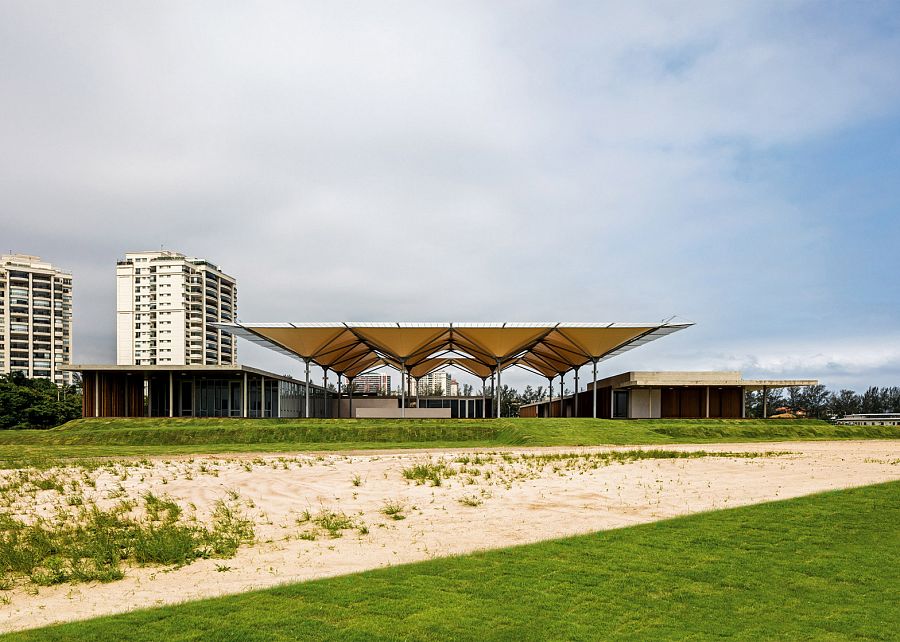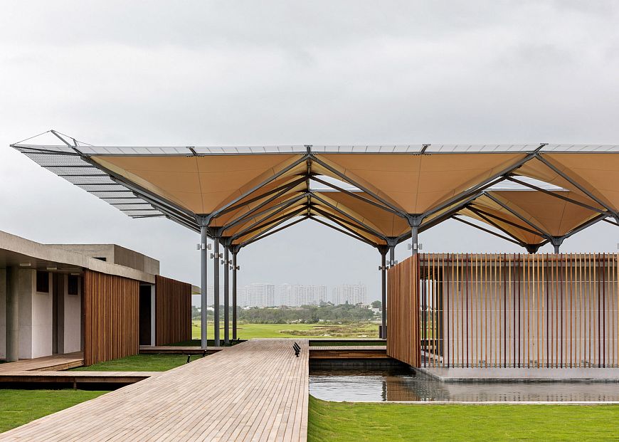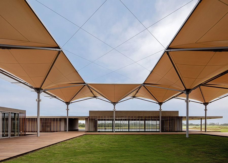 Оригинальная идея архитекторов – полупрозрачный навес, напоминающий деревья. Такая система обеспечивает игрокам легкую затененность, а также собирает дождевую воду в подземный резервуар для последующего орошения игровых полей.