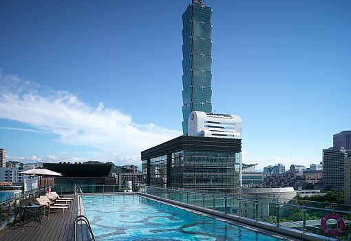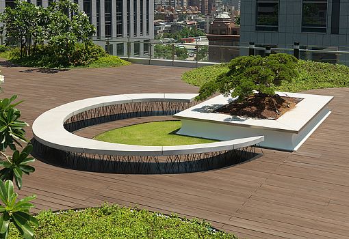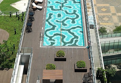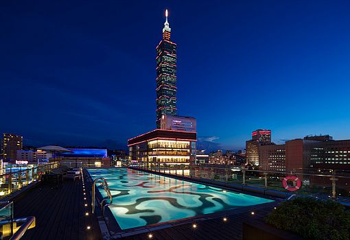 Когда тайваньскому архитектурному бюро Noiz предложили спроектировать крышу для недавно отреставрированного отеля в Тайбэе, архитекторы решили использовать природные мотивы. На площадке, расположенной на седьмом этаже здания, откуда открывается вид на города, была спроектирована деревянная терраса с колоритным бассейном в центре. Дно бассейна выложено плиткой, ее рисунок имитирует реакцию диффузии. Подобные паттерны можно наблюдать на мелководье, где волны особым образом вымывают песок, рисуя узоры. Деревянная терраса имеет участки озеленения и оригинальную скамью в форме буквы «С», которая поддерживается тонкими стальными прутьями, расположенными хаотично. Ночью в бассейне и саду включается красивая подсветка, которая видна из окон всех окружающих высоток.