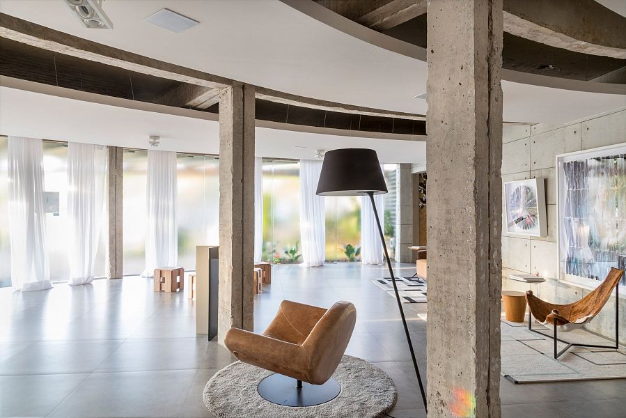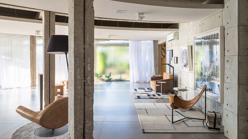 Помещение, которое нужно было реконструировать, на плане представляет собой скругленный угол. Работы начались с демонтажа межкомнатных перегородок и очистке железобетонных конструкций от элементов отделки. Основой конструкции являются три балки, поддерживаемые несколькими колоннами. В качестве ограждающих конструкций были выбраны перегородки из прозрачного стекла, благодаря которым внутрь проникает достаточно солнечного света. Стеклянные панели оборудованы поворотным механизмом: они распахиваются в направление сада.