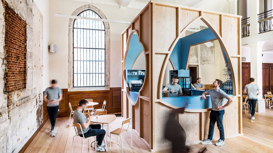 Архитекторы бюро Van Staeyen Intérieur Architecten создали необычное кафе в одном из помещений собора Святого Иоанна в Антверпене, который посещает около 300 тысяч прихожан в год.