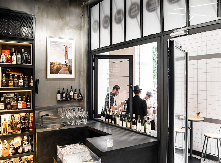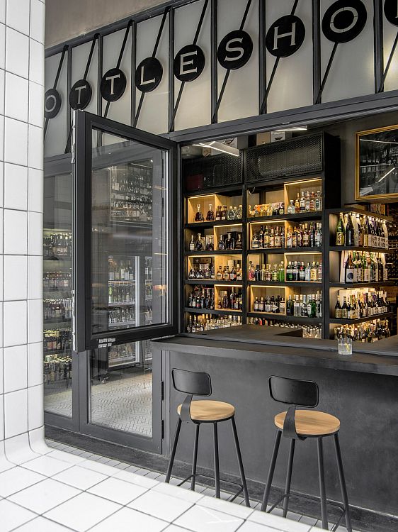 Он придумал специальные начертания для каждого типа алкогольных напитков, представленных на фасаде. Получилось что-то вроде образца публичного, уличного искусства». Главная тема в дизайне интерьера – размывание границ между функциональными зонами торговой точки и бара. Общее пространство площадью около 60 кв.м разделено на три помещения. Первое «работает» как входная зона, связывающая заведение с площадью и другими магазинами внутренней галереей с большими проемами. Горизонтальные и вертикальные поверхности здесь отделаны белой глянцевой плиткой. Второе помещение – собственно магазин, совмещенный с небольшим баром. Третья комната в глубине здания отведена под так называемый салон, то есть место, где демонстрируются редкие сорта виски и других алкогольных напитков. Стены салона украшены историческими фотографиями, приводящими нас к мысли о том, что культура потребления алкоголя связана с атмосферой и традициями маленьких магазинчиков. «Перед нами стояла задача создать пространства, которые вдохновляли бы людей, живущих городской жизнью», – резюмируют авторы.