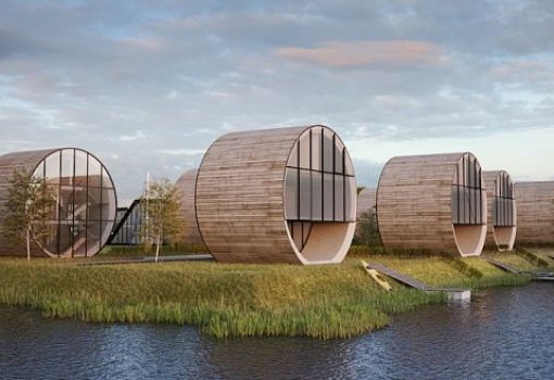 На Куршской косе в Литве скоро появится поселок, состоящий из цилиндрических трехуровневых домиков, уложенных на боковые поверхности, горизонтально. Фасады деревянных конструкций Rolling Homes (основания цилиндров) остеклены для проникновения в дома солнечных лучей. Проект вильнюсского бюро DO Architects.