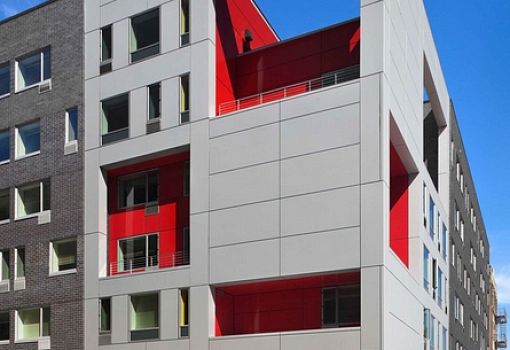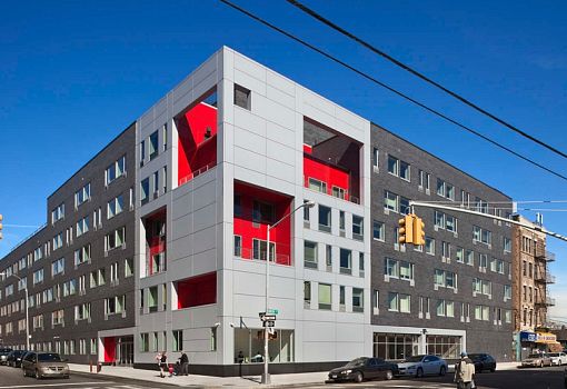 Дизайн-концепция с элементами цветового кодирования была использована американским бюро Alexander Gorlin Architects в проекте социального многоэтажного дома для людей с низкими доходами и маломобильных граждан, построенного в Южном Бронксе (Нью-Йорк, США). Объект, расположенный на перекрестке улиц, выгодно отличается от элементов массовой застройки. Архитекторы запроектировали промежуточные пространства – патио или открытые веранды, которые используются как места для социализации жителей дома. Стены патио изнутри окрашены в ярко-красный цвет, что наряду с нерегулярными оконными проемами придает привлекательность архитектурному облику постройки.