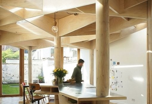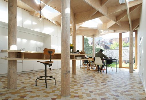 Большая площадь остекления и зенитные окна позволили наполнить интерьер дома Daylit динамичными контрастами света и тени. Архитекторы бюро Atelier Vens Vanbelle использовали дерево для создания опор в виде колонн и оригинальной конструкции навеса из пересекающихся досок. Таким образом была реализована идея прогулки по осеннему лесу, где свет пробивается сквозь облетающие кроны деревьев. При этом роль опавших листьев выполняет плитка на полу из разноцветных шестиугольников. Расположен дом в Генте (Бельгия).