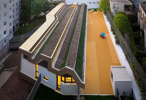 Архитекторы Wild Rabbits Architects спроектировали необычный детский сад в Париже. The Paper Nursery – сооружение с «игривым» характером. Здание расположено на естественном уклоне, что позволило авторам проекта значительно разнообразить конфигурацию игровых зон. Кровля с множественными изломами и фасетками засажена зеленью, которая создает природный оазис в городской среде. Открытые пространства для игры органично интегрированы в композицию, внутренние помещения «купаются» в естественном свете благодаря значительной площади остекления.