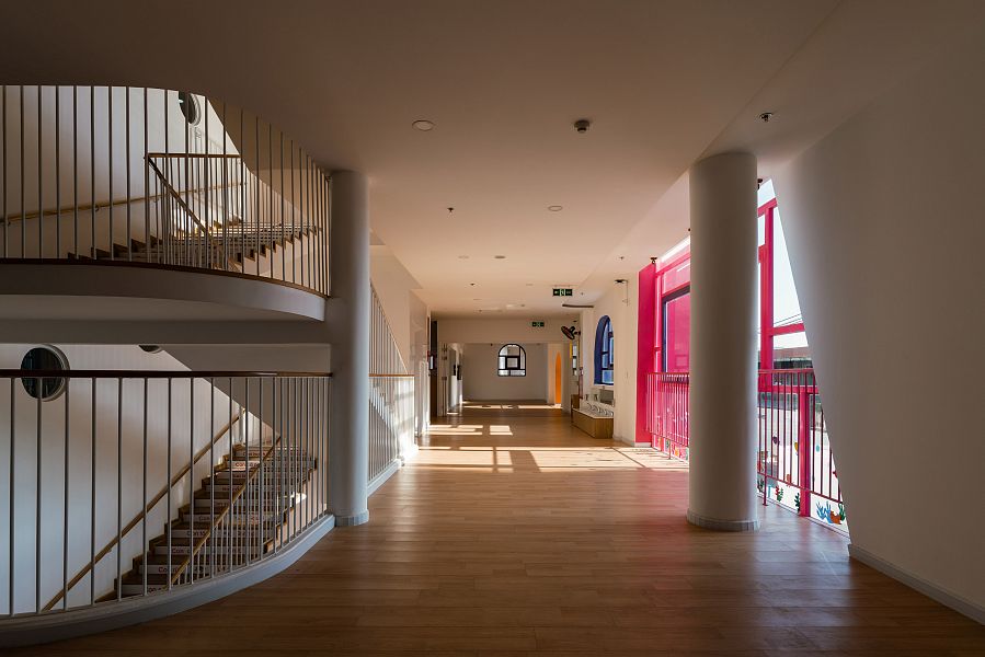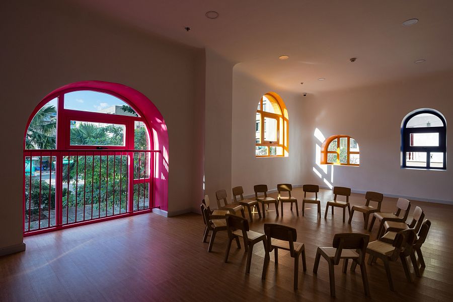 Архитекторы предприняли попытку создать не только архитектурный объект, но и игровую фантазийную среду, способствующую развитию ребенка. «Оконный проем стал важнейшим элементом концепции, — рассказывают авторы проекта. — Окна развивают воображение, вызывают естественное чувство любопытства, желание выглянуть наружу или заглянуть внутрь. Так рождаются эмоции».