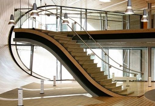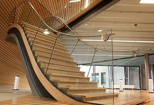 Вот такую динамичную лестницу в частном жилом доме спроектировали архитекторы бюро EeStairs. В основу конструкции легли металлические криволинейные косоуры, ступени деревянные (в количестве 20 штук), перила трубчатые, стальные, балюстрады стеклянные. Волнообразная лестница создает ощущение движения. Кажется, будто бы она «ползет» подобно полотну эскалатора.