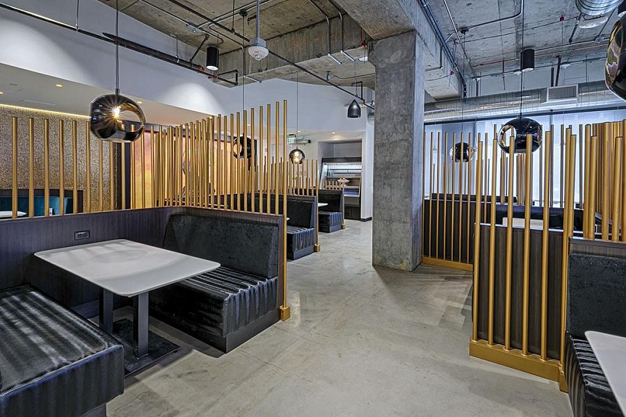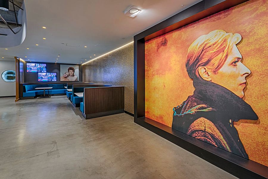 Соответствующая (индустриальная) стилистика отражена во всем интерьере, но она получает дополнение в виде ярких пятен. Такова, например, стойка рецепции со сложной геометрией и несколько агрессивным дизайном. Тематические зоны посвящены певцу Дэвиду Боуи, художнику Энди Уорхолу и городу Парижу. Интерьер щедро «приправлен» выразительными элементами – такими, как стена, увешанная гаджетами от телефона. Внутри доминируют сочетания черного и золотого цветов.