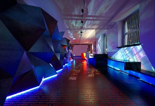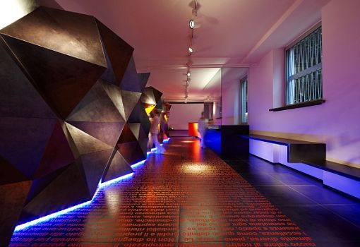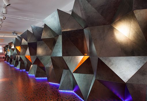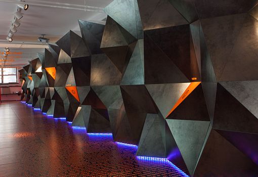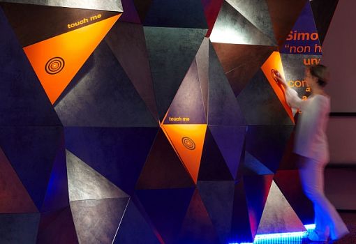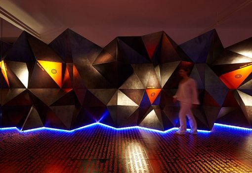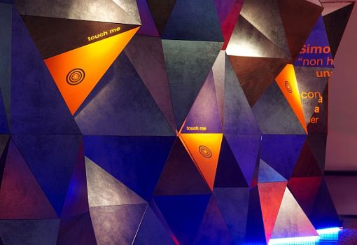 Мир стремительно меняется, и архитектурно-интерьерные парадигмы меняются вместе с ним, – считает архитектор Симоне Микели (Simone Micheli). Керамическая плитка перестает быть просто облицовочным материалом, а становится средством формирования пространства. Свою точку зрения он проиллюстрировал инсталляцией “More than a Tile”, спроектированной для итальянского производителя керамогранита. «Передо мной стояла задача выгодно показать достоинства материала, его экспрессивные возможности. Я не счел нужным изобретать новый дизайн плитки, а решил при помощи плитки «нарисовать» фрагмент архитектуры, насыщенный по содержанию», - комментирует Микели. Он «выстроил» из темного с серебряным отливом керамогранита протяженную стену со сложным полигональным рельефом. Стена многогранна не только в прямом, но и в переносном, содержательном смысле: в нее интегрированы светотехнические элементы, аудиокомпоненты, сенсоры и даже ароматические диффузоры. Темно-серый цвет материала контрастно подчеркнут яркими неоново-оранжевыми вставками, которые колористически поддержаны текстовым декором пола. Причем под ногами у посетителей не произвольный набор слов, а связно изложенная авторская концепция проекта.