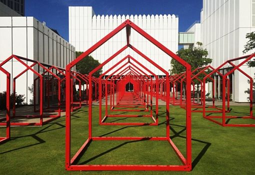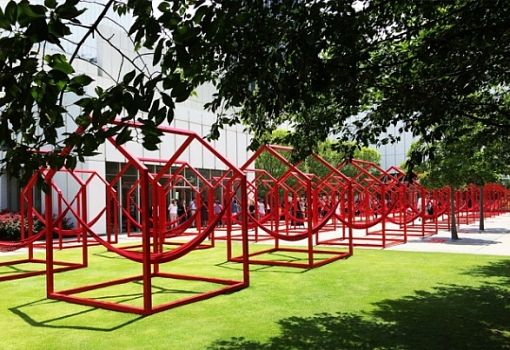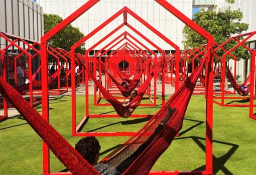 Каркасы в виде домика и натянутые по диагонали гамаки – это интерактивный городской объект, разработанный дизайнерами Гектором Эсро и Игнансио Каденой. На данный момент целый комплекс таких установок находится на городской площади центра искусств Woodriff Arts Center (Атланта, США). Каркасы с гамаками можно интегрировать в городские пространства и тем самым создать динамичные зоны отдыха и общения для жителей.